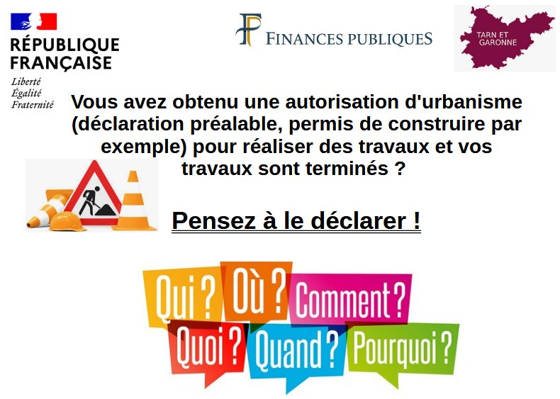 La DGFIP a connaissance de chaque autorisation d’urbanisme déposée. Il est obligatoire de déclarer la fin de vos travaux auprès de nos services. Les informations transmises permettront la mise à jour de l'évaluation de votre bien en matière d'impôts locaux ainsi que le bénéfice éventuel d'une exonération.