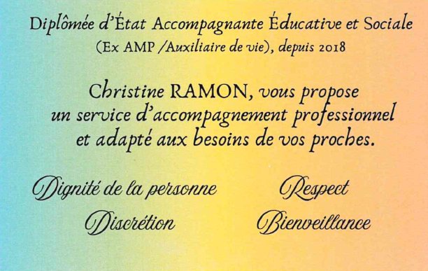 Christine RAMON, diplômée d'État Accompagnante éducative et sociale, vous propose un service d'accompagnement professionnel et adapté aux besoins de vos proches :